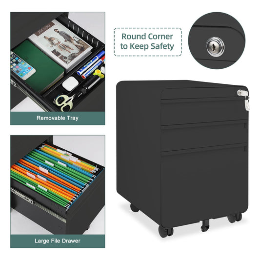 Ordnung Pro Abschließbarer Rollcontainer mit 3 Schubladen & Hängeregistratur, Stahl, Schwarz – 40 x 45 x 60 cm
