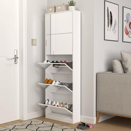 Ordnung Pro Schuhschrank mit 185 cm Ganzkörperspiegel, 30 Paar, 5 Flip-Schubladen, Weiß – Massivholz & Echtglas