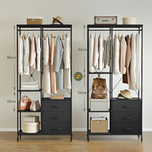 Ordnung Pro Freistehender Kleiderständer mit Rädern, Holzaufsatz & Stoffschubladen, Stahl, Schwarz